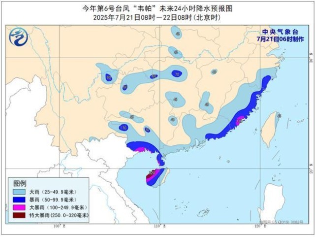 降水预报:7月21日08时至22日08时,广东中东部和西南部、香港、澳门、海南岛、广西南部和西部、福建中东部、浙江东南部、江西西部、湖南西部和南部、湖北西部、台湾岛东部以及四川盆地南部、重庆南部、贵州北部和西南部、云南东南部等地有大到暴雨,其中,广东雷州半岛、海南岛中西部和北部、广西东南部沿海等地的部分地区有大暴雨,海南岛西北部局地有特大暴雨(250~320毫米)。