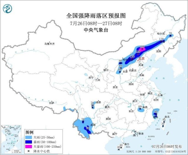 中央气象台7月26日6时继续发布暴雨黄色预警:预计,7月26日08时至27日08时,内蒙古河套东部和中东部偏南地区、陕西东北部、山西北部、河北西部和北部、北京西部和北部山区、辽宁西北部、吉林中部、黑龙江南部以及四川盆地西南部、云南中西部、江西中部、浙江南部、福建东北部、海南岛南部、台湾岛中部等地部分地区有大到暴雨,其中,内蒙古中部偏南地区、河北北部、吉林西南部等地局地有大暴雨(100~180毫米)。上述部分地区伴有短时强降水(最大小时降雨量20~50毫米,局地可超过80毫米),局地有雷暴大风等强对流天气。