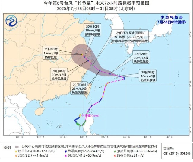 另据“上海发布”微信公众号7月28日消息,中央气象台最新消息,今年第8号台风“竹节草”减弱后的低压环流7月27日晚上在琉球群岛以东洋面再度发展为台风(该续编台风中央气象台将继续维持原台风名称“竹节草”和编号2508不变),今天早上8点钟其中心位于距离浙江省舟山市东偏南方向约700公里,就是北纬26.7度、东经128.3度,中心附近最大风力有8级(18米/秒),中心最低气压为992百帕,七级风圈半径200至300公里。预计,“竹节草”将以每小时15至20公里的速度向西偏北方向移动,强度缓慢增强,即将进入东海东部海面,并向浙江北部到江苏南部一带沿海靠近。