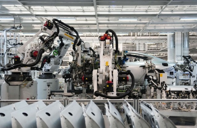 2025年6月16日,机器人在北京小米汽车工厂车间流水线上工作。