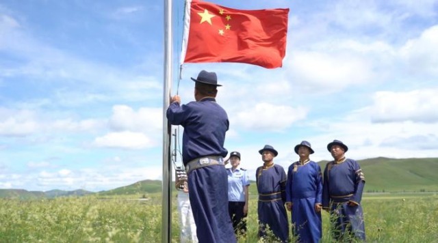 科右前旗守望草原巡防队满族屯分队举行升旗仪式。蒋豪文 摄