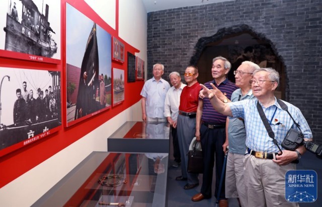 2019年7月4日,在南京渡江胜利纪念馆,王生(右一)与南钢离休老干部参观史料陈列展,庆祝新中国成立70周年。新华社发(吴斌 摄)