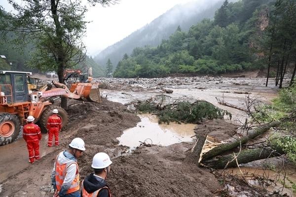 8月8日,救援人员在榆中县马坡乡山洪灾害现场抢修中断道路。 金万贵/摄(新华社发)