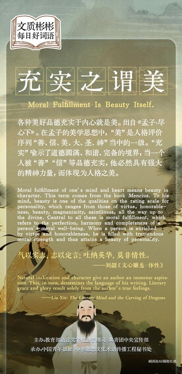 Moral fulfillment of one's mind and heart means beauty in character. This term comes from the book Mencius. Mencius' understanding of beauty relates closely to Confucian morality. To his mind, beauty is one of the qualities on the rating scale for personality, which ranges from those of virtue, honorableness, beauty, magnanimity, saintliness, all the way up to the divine. Central to all these is moral fulfillment, which refers to the perfection, harmony and completeness of a person's moral well-being. When a person is enriched by virtue and honorableness, he is filled with tremendous moral strength and thus attains a beauty of personality. In other words, beauty is a spiritual state of worthiness achievable when moral self-sufficiency becomes elevated into an aesthetic ecstasy, reflecting the Confucian ideal of perfect harmony between morality and aesthetics, or that between beauty and goodness. In literary criticism, this is shown via the argument that a writer should strive to be upright before he can create noble-spirited works. This term sets moral fulfillment as an important criterion for judging the quality of a literary work, and advocates a unity between artistic excellence and moral well-being.