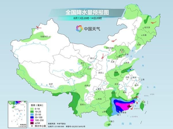 13日至15日,台湾岛、福建南部、广东、广西、江西南部、湖南南部、贵州有大到暴雨,部分地区大暴雨,局地特大暴雨,部分地区累计降水量100至250毫米,局地300至400毫米。