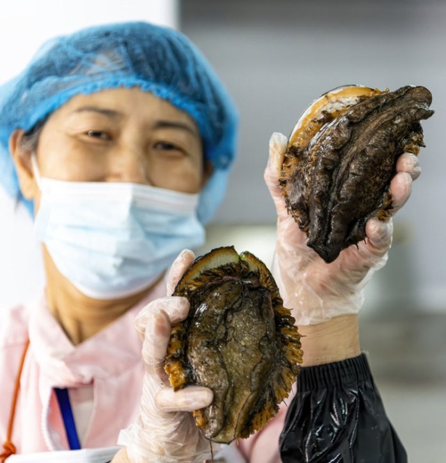 2025年5月16日,在位于福建莆田市涵江区的福建省新膳海洋食品有限公司,工人展示超大规格活鲍鱼。