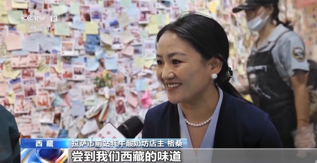 拉萨市前站牦牛酸奶坊店主 格桑:牦牛奶不能够超过三个小时,超过三个小时就会坏。路好了之后,我们就可以到更远的地方去采购更新鲜的牦牛奶,包括蛋糕上面的青稞粉是日喀则的,人参果是从那曲运过来的,现在交通便利了,所以我们可以用最地道的食材做最地道的酸奶,也能让天南地北的游客尝到我们西藏的味道。