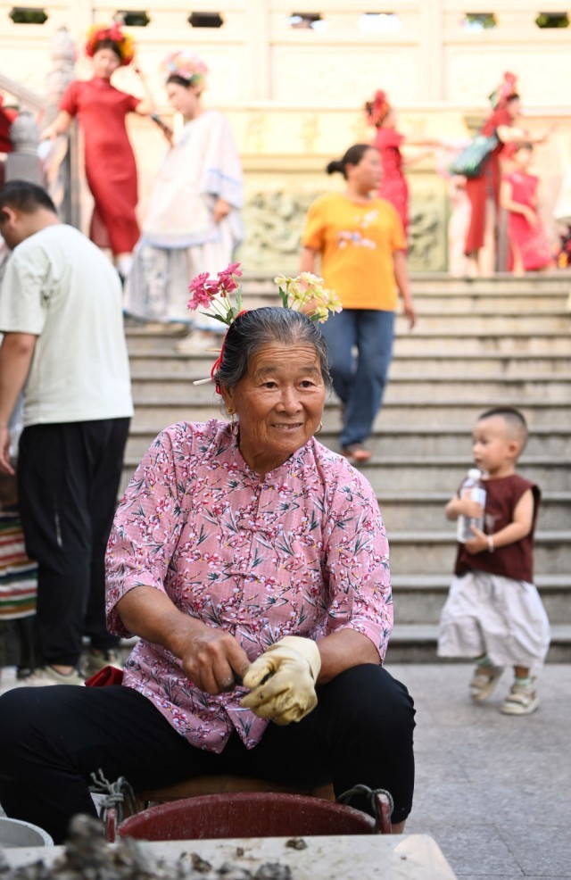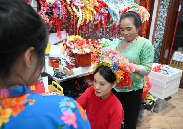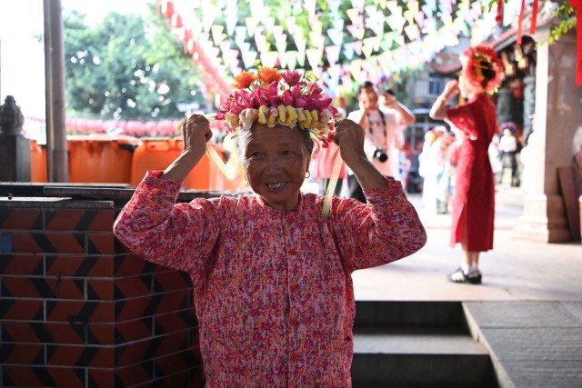 8月18日,福建泉州蟳埔村,身着蟳埔传统“簪花围”服饰的店主为游客簪发戴花。