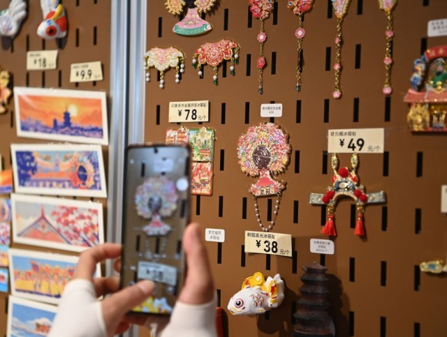 8月18日,福建泉州蟳埔村,一名参观者在拍摄簪花造型冰箱贴。