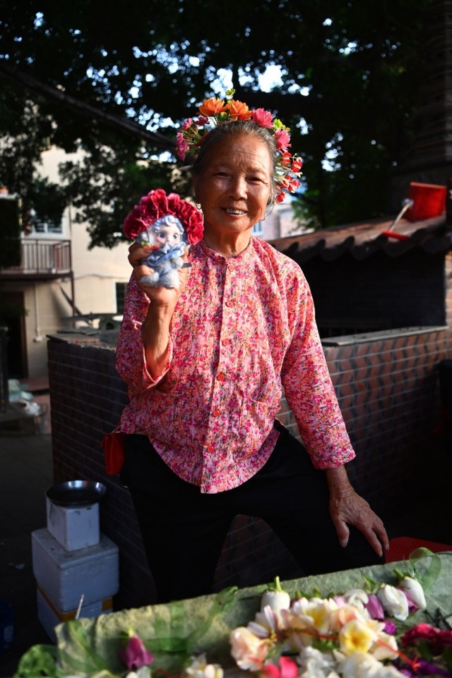 8月18日,福建泉州蟳埔村,一名蟳埔女在展示簪好花围的毛绒玩具。