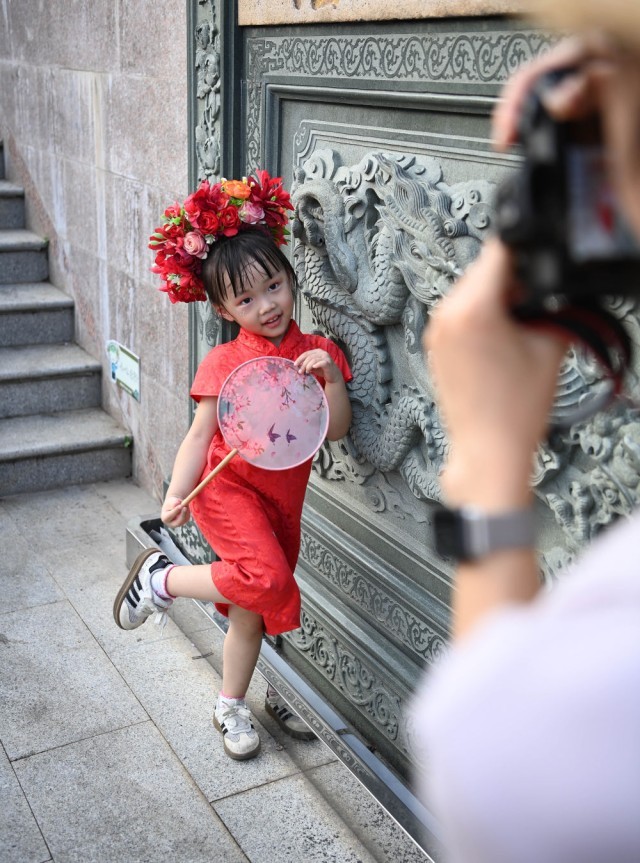 8月18日,福建泉州蟳埔村,一名体验“簪花围”的小游客在拍照留念。