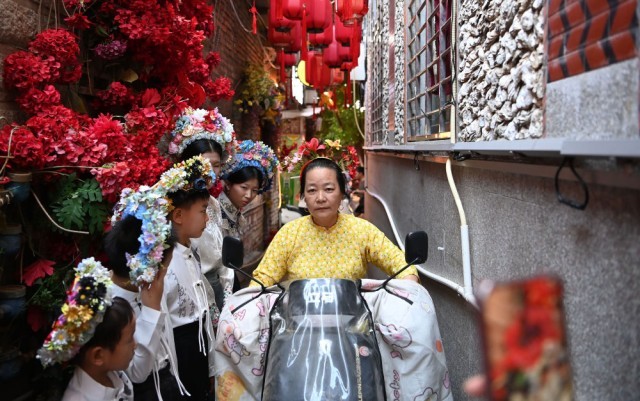 8月18日,福建泉州蟳埔村,一名蟳埔女骑电动车从几名体验“簪花围”的游客前经过。