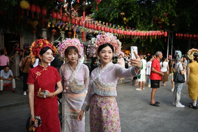 8月18日,福建泉州蟳埔村,体验“簪花围”的游客合影留念。