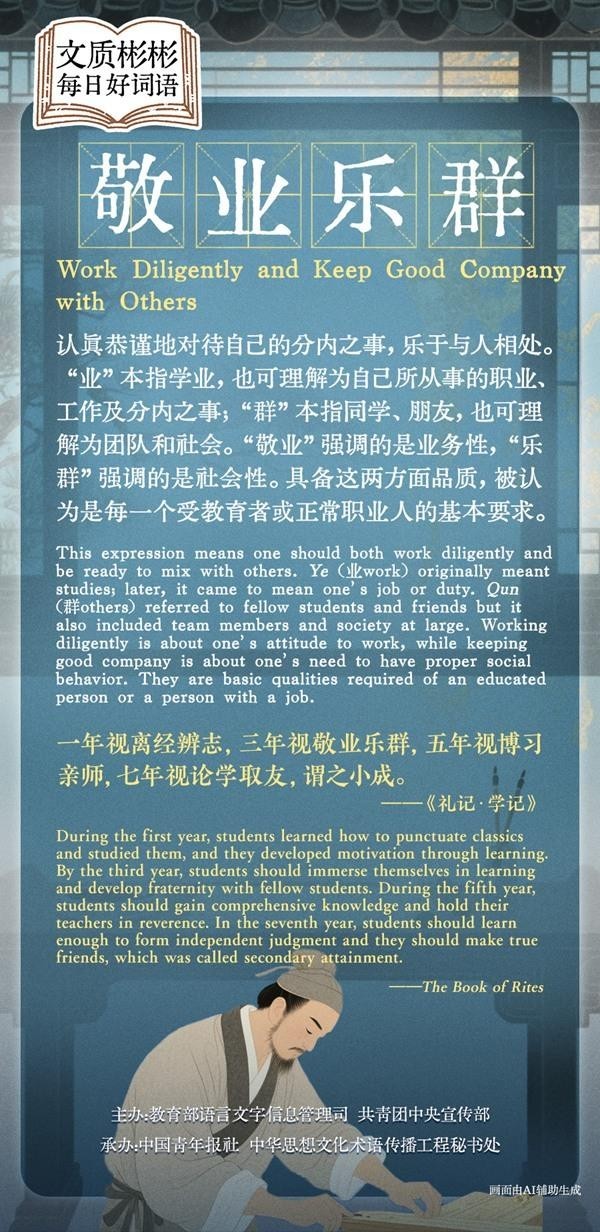 This expression means one should both work diligently and be ready to mix with others. Ye originally meant studies; later, it came to mean one's job or duty. Qun referred to fellow students and friends, but it also included team members and society at large. Working diligently is about one's attitude to work, while keeping good company is about one's need to have proper social behavior. They are basic qualities required of an educated person or a person with a job.