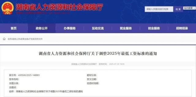 湖南省人社厅于近日印发了《关于调整2025年最低工资标准的通知》,从2025年9月1日起,调整全省最低工资标准。