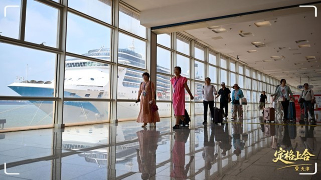 旅客在天津国际邮轮母港入境。