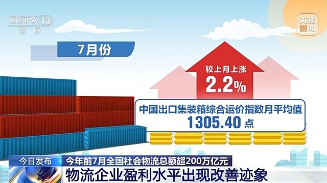 中国物流与采购联合会今天公布今年前7个月物流运行数据。1-7月份,我国物流运行延续稳中有进的发展态势,社会物流总额突破200万亿元,高端制造、绿色低碳等领域物流需求增长强劲。