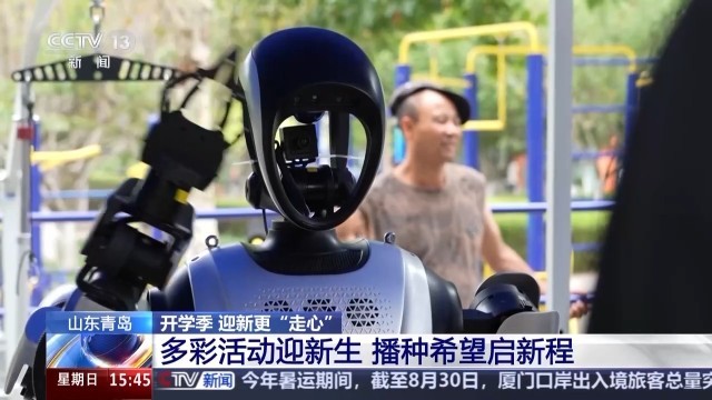 在山东青岛,中国石油大学(华东)校园门口、道路两旁,随处可见迎接新生的横幅,场面热烈,迎新氛围满满。在一处报名处,两个智能机器人和一只机器狗,引来众人围观。