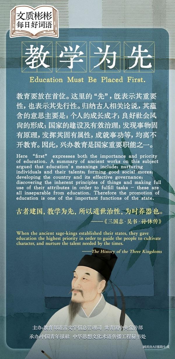 Citation:When the ancient sage-kings established their states, they gave education the highest priority in order to guide the people to cultivate character, and nurture the talent needed by the times. (The History of the Three Kingdoms)