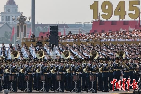9月3日,北京天安门广场,纪念中国人民抗日战争暨世界反法西斯战争胜利80周年大会,军乐团奏乐,合唱团高歌。中青报·中青网记者 曲俊燕/摄