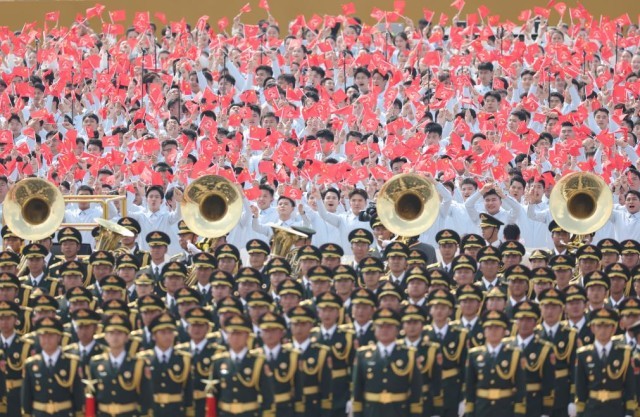 9月3日,纪念中国人民抗日战争暨世界反法西斯战争胜利80周年大会在北京隆重举行。这是中国人民解放军联合军乐团和合唱团。新华社记者 陈斌 摄