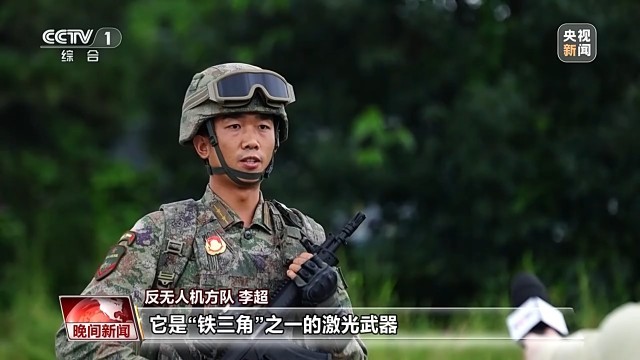 反无人机方队 李超:它是“铁三角”之一的激光武器,通过发射高能光束来毁伤目标。战斗中,它没有爆炸声,没有火光、没有后坐力,发射即到达,是一款无限发射的新型武器。