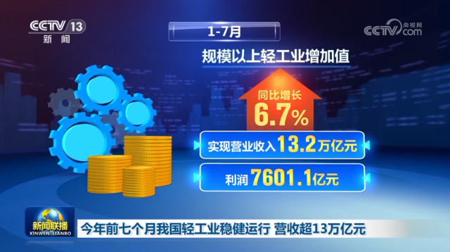 中国轻工业联合会数据显示,今年前七个月,在扩内需、促消费政策支持下,我国轻工业运行稳健,生产、营收、市场规模均保持良好态势。规模以上轻工业增加值同比增长6.7%,实现营业收入13.2万亿元、利润7601.1亿元。