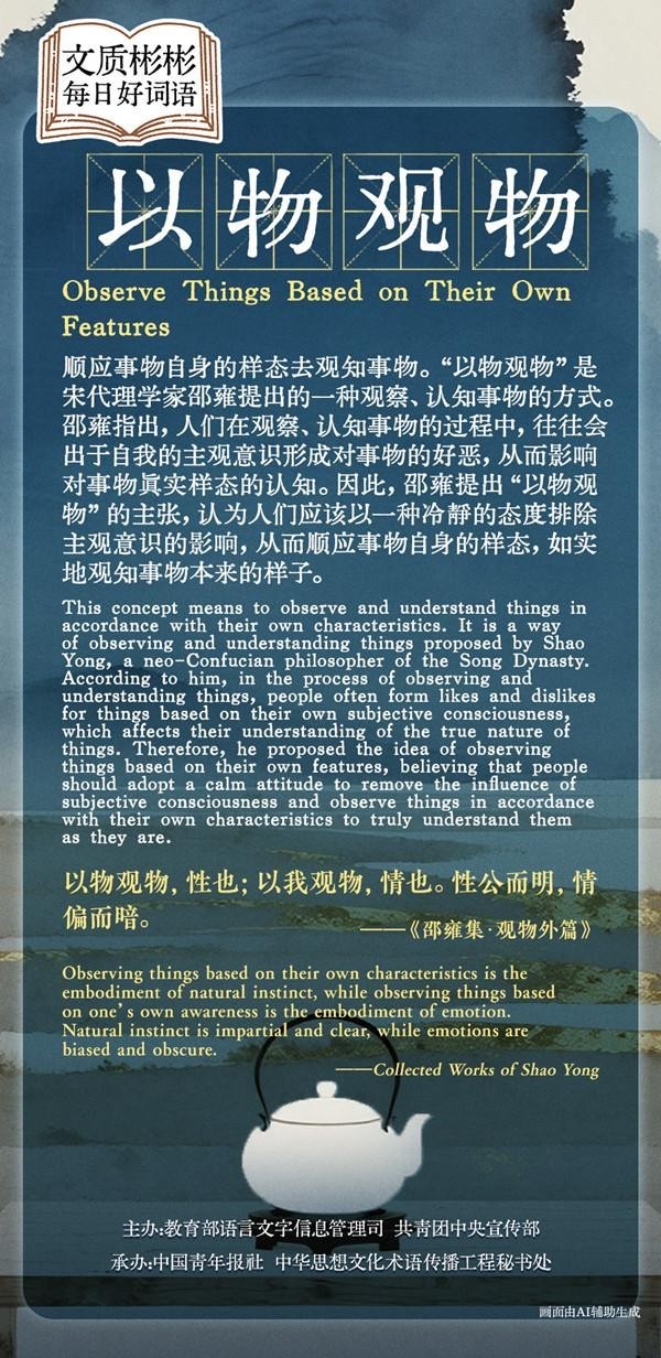This concept means to observe and understand things in accordance with their own characteristics. It is a way of observing and understanding things proposed by Shao Yong, a neo-Confucian philosopher of the Song Dynasty. According to him, in the process of observing and understanding things, people often form likes and dislikes for things based on their own subjective consciousness, which affects their understanding of the true nature of things. Therefore, he proposed the idea of observing things based on their own features, believing that people should adopt a calm attitude to remove the influence of subjective consciousness and observe things in accordance with their own characteristics to truly understand them as they are.