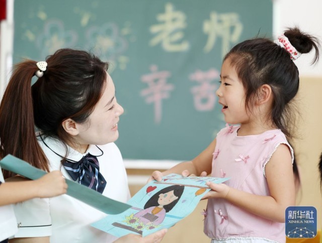 9月9日,山东省临沂市郯城县郯城街道官塘幼儿园的孩子将在老师的指导帮助下制作的绘画送给老师。新华社发(张春雷摄)