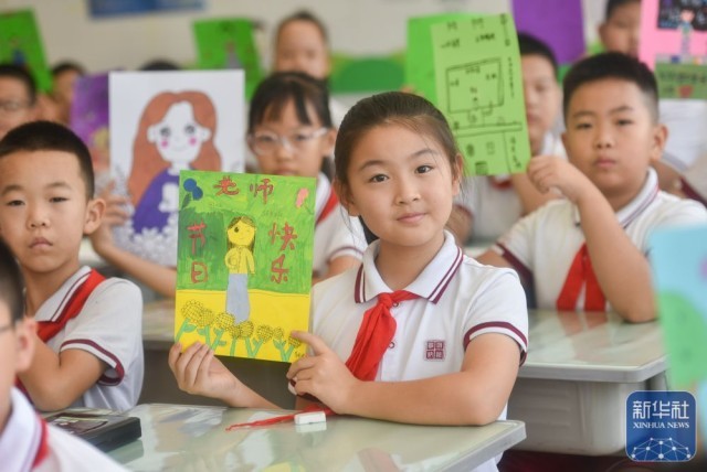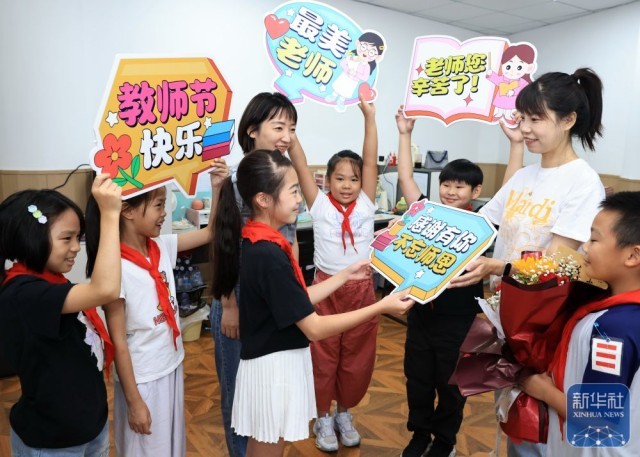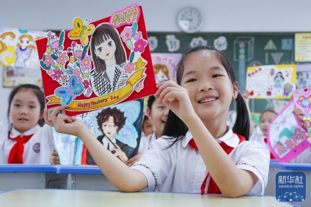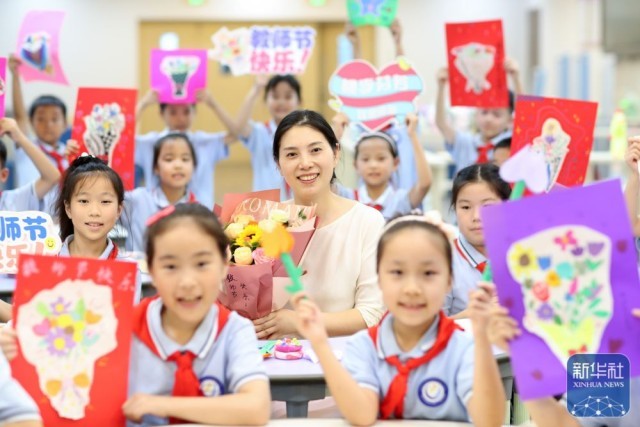 9月9日,在武汉市未来实验小学美林校区,学生为教师送上节日祝福。新华社发(赵军摄)