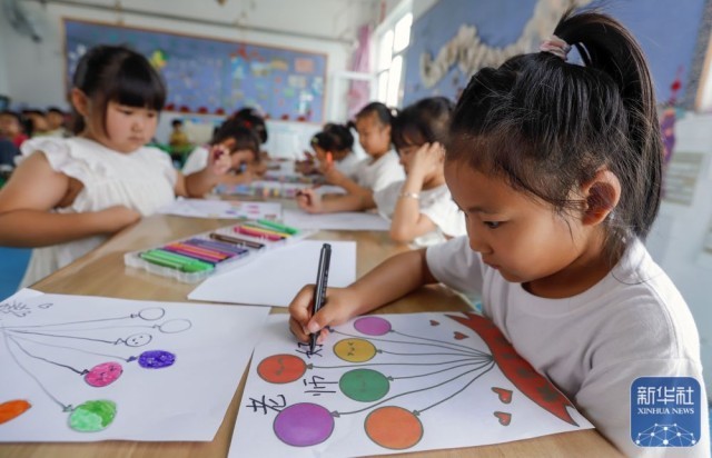 9月9日,河北省遵化市遵化镇南关幼儿园的小朋友在绘制美术作品感念师恩。新华社发(刘满仓摄)