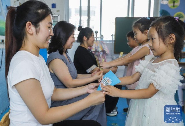 9月9日,河北省遵化市遵化镇南关幼儿园的小朋友给老师送贺卡,祝福教师节。新华社发(刘满仓摄)