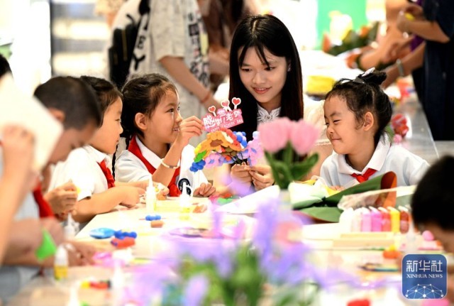 9月9日,在河北省石家庄市柏林庄学校开展的“黏土做花寄师恩”主题活动中,孩子们用粘土制作花束,为老师送上节日的祝福。新华社发(陈其保摄)