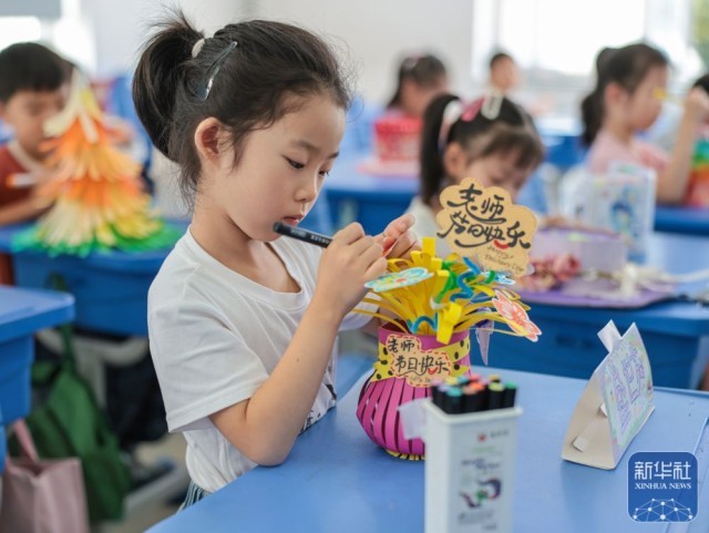 9月9日,在山东省荣成市府新小学教室内,孩子们在制作送给老师的手工作品。新华社发(李信君摄)