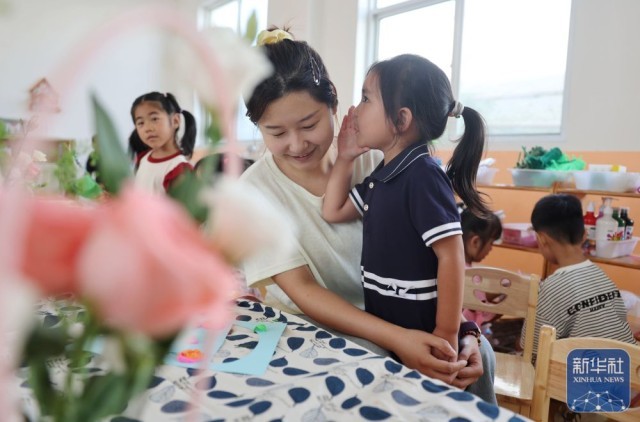9月9日,在山东省临沂市沂南县铜井镇中心幼儿园,小朋友在跟老师分享节日祝福悄悄话。新华社发(王彦冰摄)