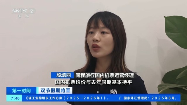 同程旅行国内机票运营经理 殷培丽:国内机票均价与去年同期基本持平,呈现“首尾高、中间低”的特征,小众目的地受到青睐,反向旅行趋势显著。截至9月11日,假期出行的国内机票搜索热度增幅最大的城市分别为:伊宁、泸州、海拉尔、揭阳、赣州、扬州、徐州、芒市、阿勒泰、遵义。