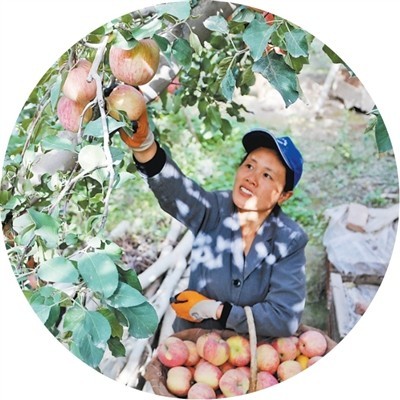 新疆阿克苏地区,果农在采收苹果。
