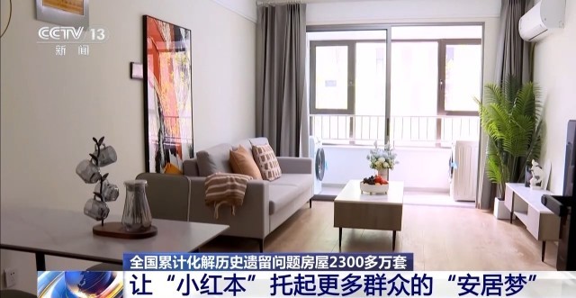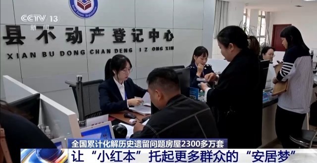 截至目前,全国累计化解历史遗留问题房屋2300多万套。今年以来,已化解230多万套。群众不仅拿到“红本本”,与之相关的落户、入学、买卖等难题也迎刃而解。同时,源头防范新增问题的长效机制加快构建,全国2300多个县市实施新建商品房项目“交房即交证”改革,发放不动产权证书840多万本,群众在拿到新房钥匙的同时就能领到不动产权证书。