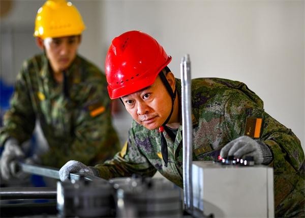 火箭军某旅一级军士长崔道虎(右一)调试革新设备。刘明松/摄