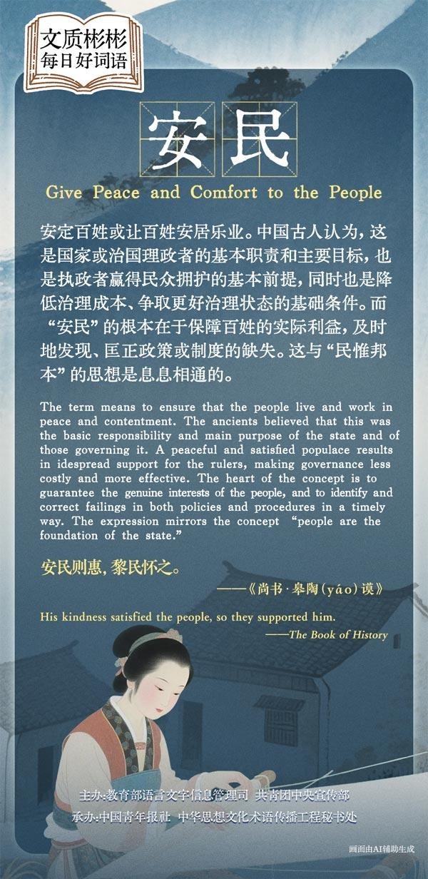The term means to ensure that the people live and work in peace and contentment. The ancients believed that this was the basic responsibility and main purpose of the state and of those governing it. A peaceful and satisfied populace results in widespread support for the rulers, making governance less costly and more effective. The heart of the concept is to guarantee the genuine interests of the people, and to identify and correct failings in both policies and procedures in a timely way. The expression mirrors the concept "people are the foundation of the state".