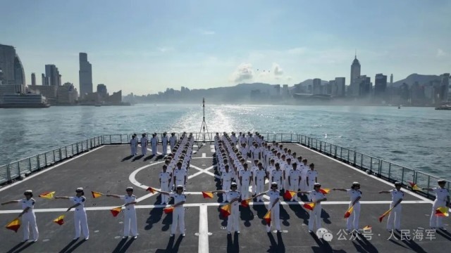 8时许,戚继光舰和沂蒙山舰在香港特区政府船队、驻香港部队舰艇伴航下,缓缓进入香港附近水域。在戚继光舰后甲板上,100余名官兵在甲板上摆出“76”字样,并且,继山东舰航母编队抵达香港之后,再次用旗语,展示出“国安家好”的含义,为新中国成立76周年和香港市民送上祝福。岸边,香港市民向舰上分区列队的学员和官兵挥手致意。按照预定方案,编队停靠在昂船洲军营码头。这是海军戚继光舰和沂蒙山舰2艘舰艇首次来到香港。