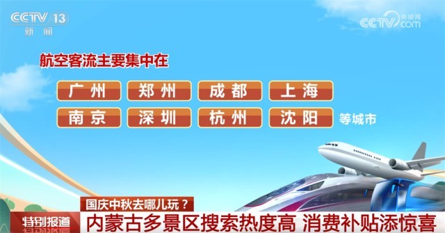 自驾游成为出行主流。航空客流主要集中在广州、郑州、成都、上海、南京、深圳、杭州、沈阳等城市。此外,内蒙古还推出总计1000万元电影消费补贴,用户最高可领取60元电影消费券。
