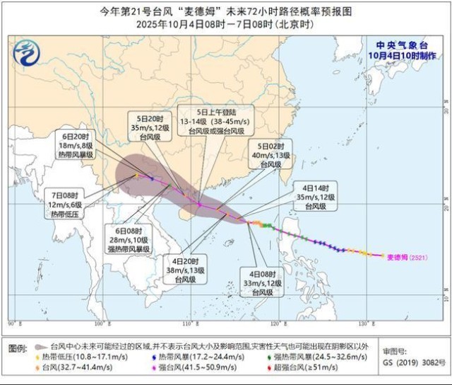 大风预报:4日14时至5日14时,巴士海峡、南海北部和中部海域、东沙群岛、西沙群岛、中沙群岛及黄岩岛附近海域、北部湾、琼州海峡、广西沿海、广东西南部及沿海、海南岛及沿海、台湾岛南部沿海有5-7级、阵风8-10级的大风,其中,南海西北部海域、琼州海峡、北部湾东部海域、广东西部沿海、海南岛东部和北部沿海的风力有8-11级,阵风12-13级,“麦德姆”中心经过的附近海域或地区风力可达12-14级,阵风15-16级。