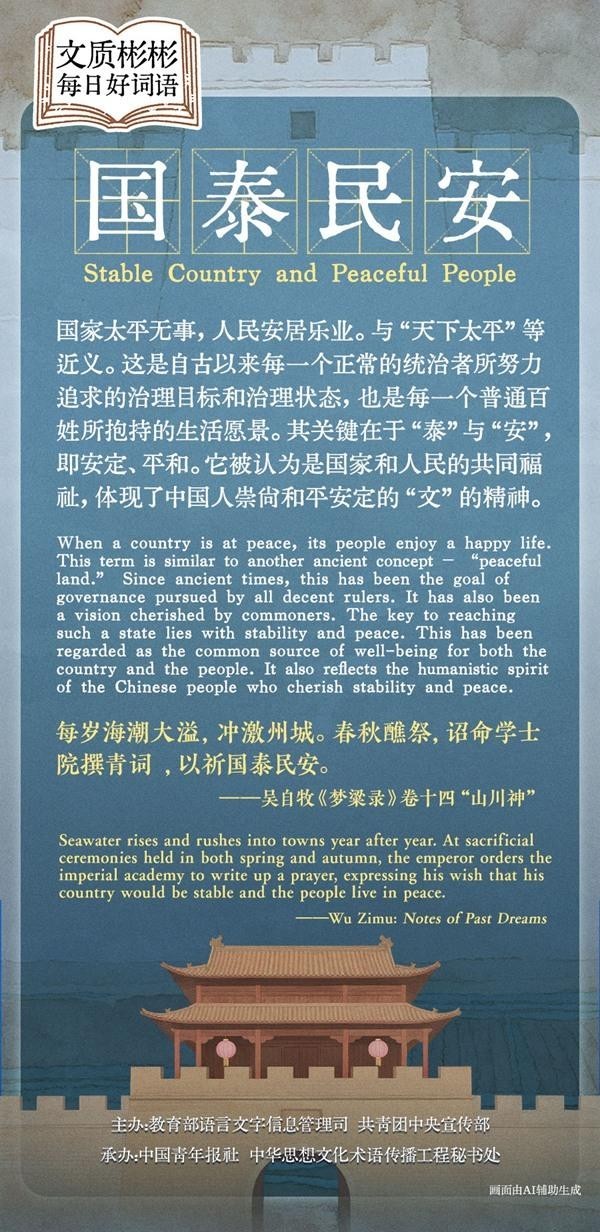When a country is at peace, its people enjoy a happy life. This term is similar to another ancient concept-"peaceful land". The key to reaching such a state lies with stability and peace. This has been regarded as the common source of well-being for both the country and the people. It also reflects the humanistic spirit of the Chinese people who cherish stability and peace.