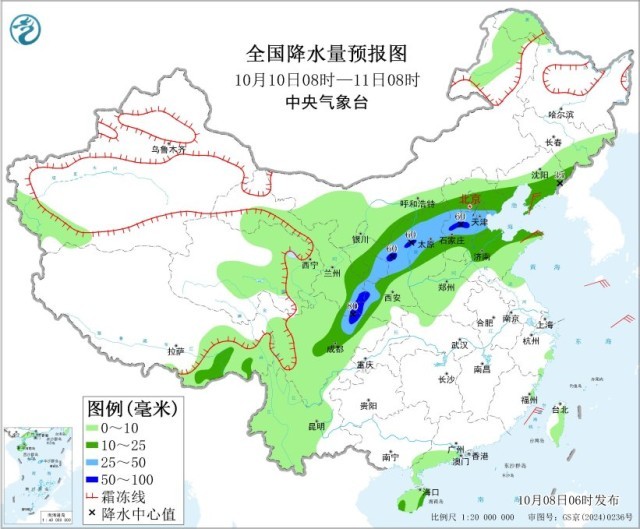 10月9日08时至10日08时,辽宁东部、四川东北部、甘肃东部、宁夏中南部、陕西北部、山西中北部、京津冀、山东北部、河南西部等地部分地区有中到大雨,其中,陕西北部、山西北部、河北中部、天津、山东北部等地部分地区有暴雨(50~80毫米)。辽东半岛、华北东部、黄淮等地部分地区有4~6级风。渤海、东海北部海域将有5~7级、阵风8级的东北风。