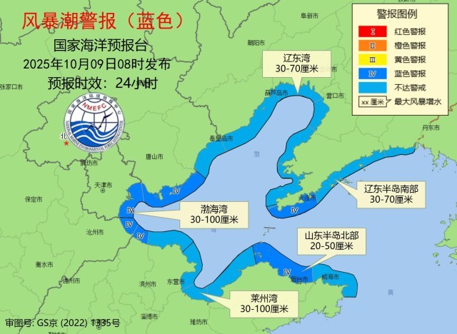 48小时预报:10月10日白天,渤海湾、莱州湾和山东半岛北部沿海将出现30到100厘米的风暴增水,山东省潍坊市和烟台市的风暴潮预警级别为蓝色。10日傍晚解除风暴潮警报。