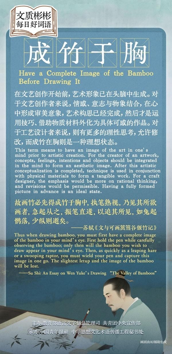 在文艺创作开始前,艺术形象已在头脑中生成。对于文艺创作者来说,情感、意志与物象需在心中结合,形成审美意象,完成这一艺术构思后,再运用技巧、借助物质材料外化为具体可感的作品。对于工艺设计者来说,则更强调理性思考,允许修改,而成竹在胸则是一种理想状态。