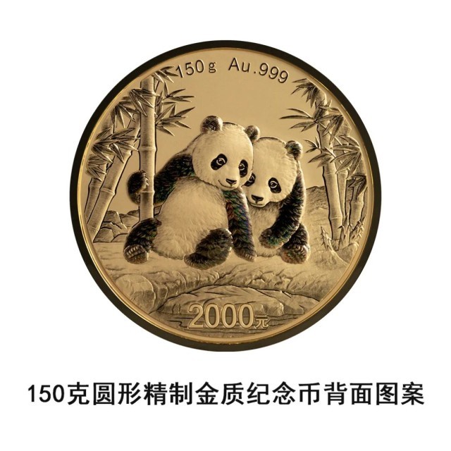 (九)150克圆形金质纪念币为精制币,含纯金150克,直径60毫米,面额2000元,成色99.9%,最大发行量5000枚。