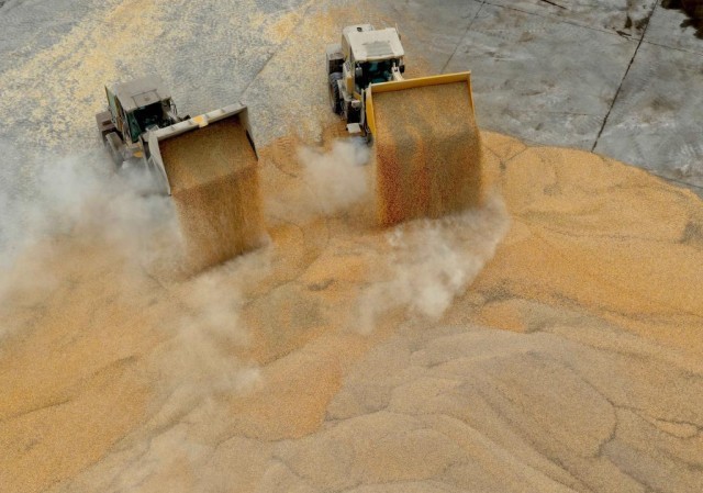 10月14日,在安徽省亳州市谯城区双沟镇三官村方向家庭农场,农民操作铲车整理烘干后的玉米(无人机照片)。新华社发(刘勤利 摄)