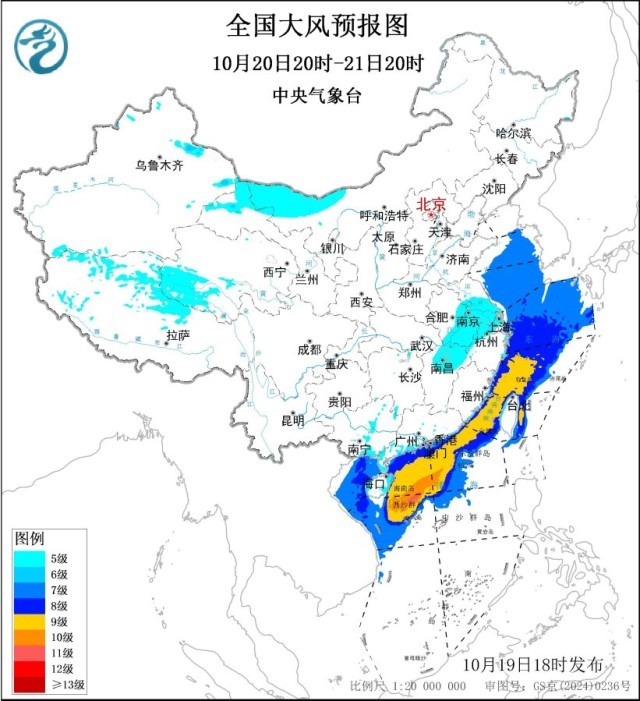 10月20日20时至21日20时,新疆北部和东部、甘肃河西、西藏西部和北部、青海南部、内蒙古西部和东部、江苏南部、安徽南部、浙江北部、江西北部、广东南部、广西南部等地部分地区有5~6级风,阵风7~8级;东海西南部海域、台湾海峡、台湾以东部分海域、南海北部和中西部的偏北海域将有9~10级、阵风11~12的大风。黄海中部和南部海域、东海北部海域、台湾以东洋面、北部湾将有7~8级、阵风9级的大风。